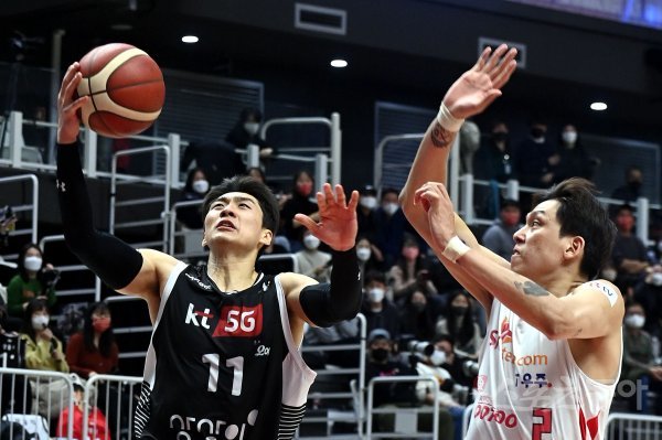 26일 경기도 수원 KT아레나에서 열린 ‘2021-2022 정관장 프로농구’ 수원 kt와 서울 SK의 경기에서 kt 양홍석이 SK 최준용의 수비를 피해 슛을 쏘고 있다.