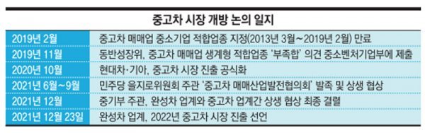 중고차 매매업은 2013년 동반성장위원회가 중소기업 적합업종으로 지정했다. 이후 2016년 한 차례 더 연장(3년 기한)돼 2019년 2월까지 대기업의 진입이 제한됐다.