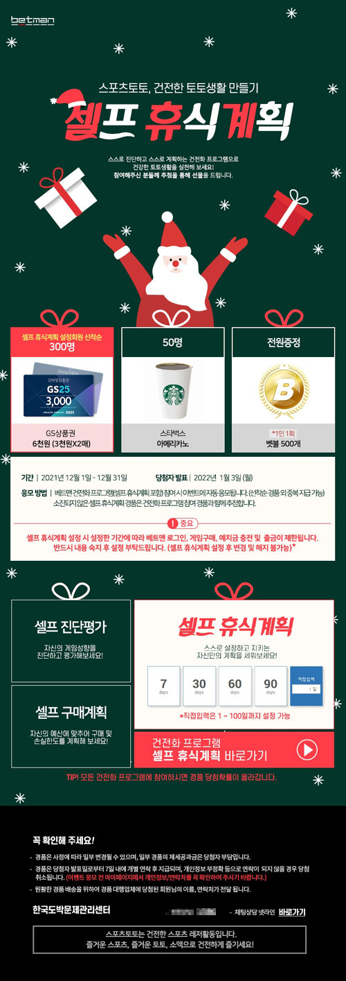 이 중 ‘셀프 휴식계획’을 선착순으로 설정한 300명에 한해 상품권의 경품 당첨 기회가 주어지며, 이벤트 참여자 전원에게는 1인 1회에 한해 베트맨 사이트 내의 다양한 경품 응모가 가능한 벳볼도 지급된다.