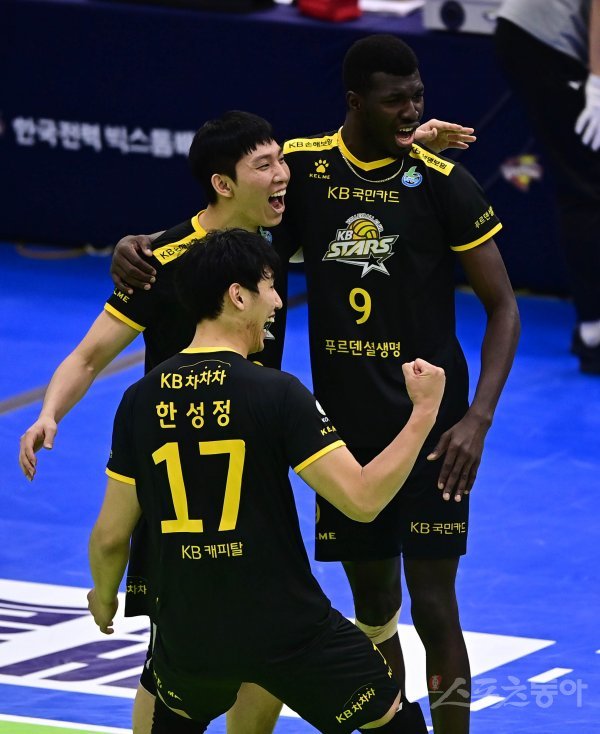 28일 경기도 수원체육관에서 열린 ‘2021~2022 도드람 V-리그’ 남자부 수원 한국전력과 의정부 KB손해보험의 경기에서 KB손해보험 한성정, 황택의, 케이타가 득점에 성공한 후 기쁨을 나누고 있다.