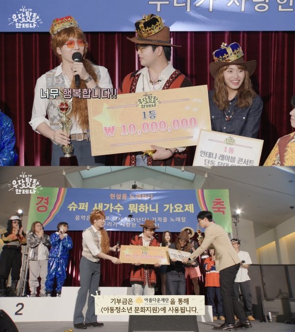 소속사 안테나에 따르면 아티스트들이 오늘(29일) ‘우당테나’에서 진행된 ‘슈퍼새가수 뭐하니 가요제’의 우승 상금 천만 원을 아름다운재단에 기부했다.