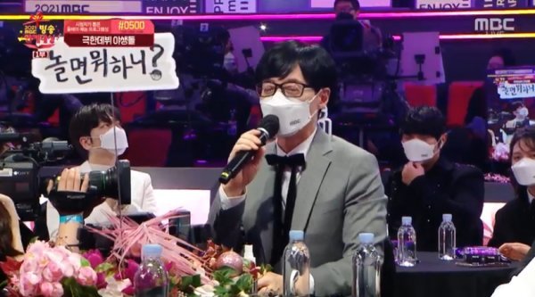 유재석은 13일 코로나19 확진 판정을 받고 보건당국의 임상적 판단에 따라 재택치료를 받았다. 치료를 마치고 21일부로 격리 해제됐다. 앞서 ‘2021 SBS 연예대상’과 ‘2021 KBS 연예대상’에는 참석하지 않았으나 지상파 3사 가운데 유일하게 오늘 ‘2021 MBC 방송연예대상’에 참석했다.