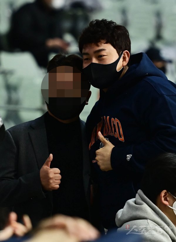 29일 서울 장충체육관에서 열린 ‘2021~2022 도드람 V-리그’ 남자부 서울 우리카드와 대전 삼성화재의 경기에 앞서 템파베이 최지만이 팬과 함께 기념 촬영을 하고 있다.