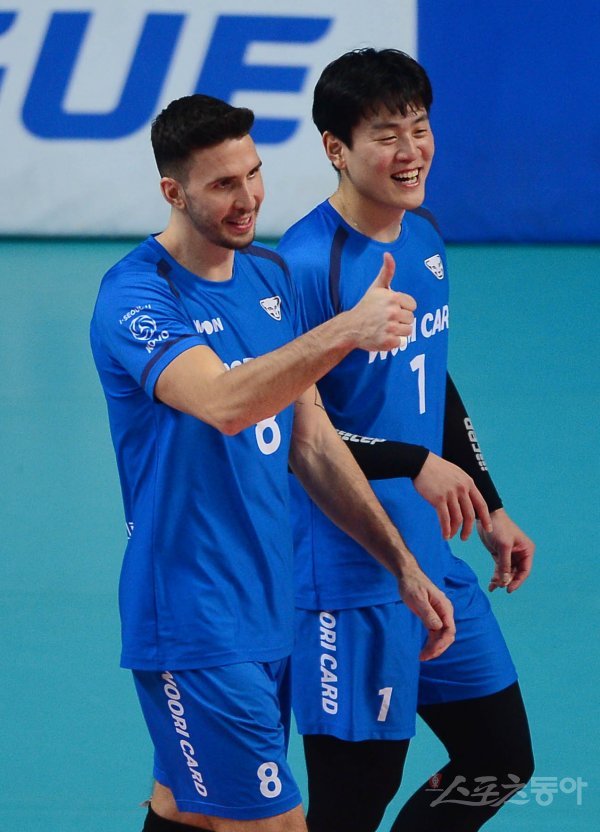 29일 서울 장충체육관에서 열린 ‘2021~2022 도드람 V-리그’ 남자부 서울 우리카드와 대전 삼성화재의 경기에서 우리카드 알렉스가 득점에 성공한 후 동료를 향해 엄지를 치켜세우고 있다.