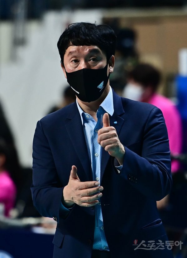 29일 서울 장충체육관에서 열린 ‘2021~2022 도드람 V-리그’ 남자부 서울 우리카드와 대전 삼성화재의 경기에서 우리카드 신영철 감독이 선수들에게 엄지를 치켜세우고 있다.