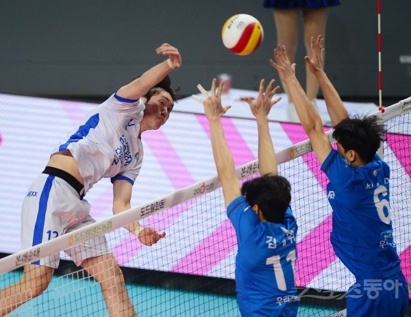 29일 서울 장충체육관에서 열린 ‘2021~2022 도드람 V-리그’ 남자부 서울 우리카드와 대전 삼성화재의 경기에서 삼성화재 황경민이 스파이크를 때리고 있다.