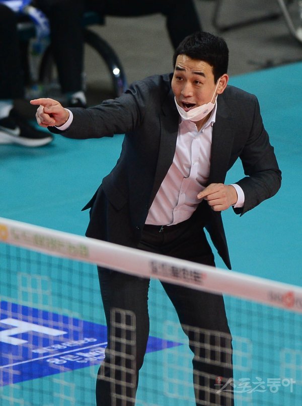 29일 서울 장충체육관에서 열린 ‘2021~2022 도드람 V-리그’ 남자부 서울 우리카드와 대전 삼성화재의 경기에서 삼성화재 고희진 감독이 선수들에게 작전 지시를 하고 있다.