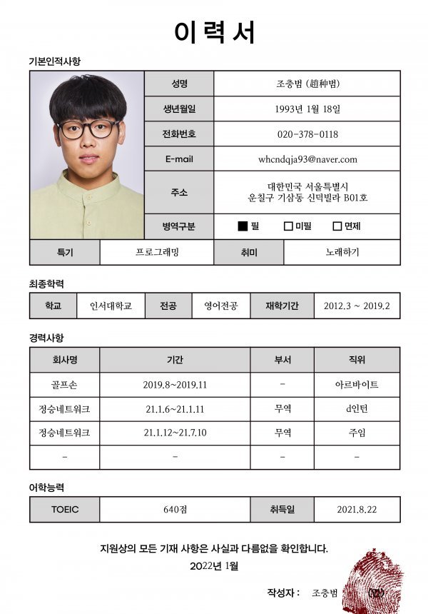 이력서 속 특기와 취미란에는 시즌 1-3에서 조충범이 어깨 너머 배운 프로그래밍과 정승네트워크 면접 당시 선보였던 장기인 노래가 적혀있다. 여전히 이렇다할 특기도, 취미도 없는 조충범 그 자체를 엿볼 수 있어 웃음을 유발한다. 뒤이어 기재된 조충범의 경력사항과 어학능력 역시 ‘좋좋소’만의 리얼함과 디테일이 고스란히 담겨있어 눈길을 끈다. 취업 전 그의 유일한 경력이었던 골프장 아르바이트와 정승 네트워크에서 쌓은 7개월의 시간, 그리고 토익 640점이 조충범의 단촐한 스펙 전부다.