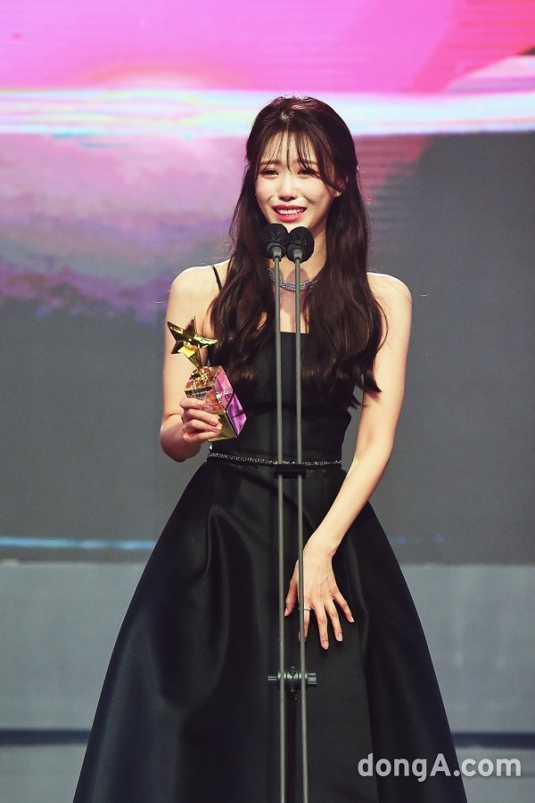 이미주가 29일 열린 ‘2021 MBC 방송연예대상’에서 여자 신인상을 수상한 뒤 소감을 말하고 있다.