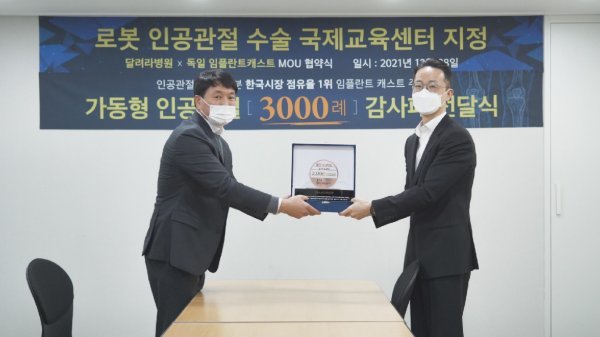 이날 협약식에서 임플란트캐스트는 달려라병원의 무릎 인공관절 수술 3000례를 축하하며 감사패를 전달했다.