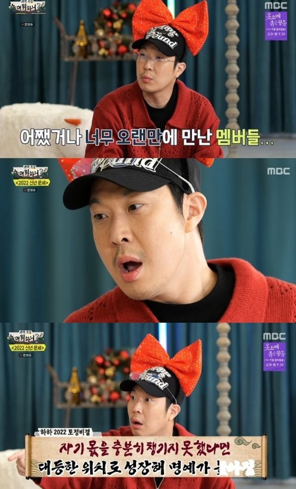 또한 하하와 '놀면 뭐하니?+' 멤버들은 2022년 임인년을 맞이해 토정비결을 통해 신년운세를 확인했다. 하하는 '어려웠던 운이 바뀌어 10년간 좋은 운이 들어온다. 내년부터 10년 인생 전성기를 맞이한다'는 내용의 신년 운세 풀이를 받아 모두의 부러움을 샀다.