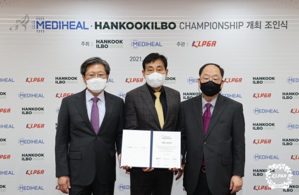 ‘마스크 팩 신화’를 통해 유니콘 기업으로 주목받고 있는 글로벌 뷰티 브랜드 메디힐이 새해 KLPGA 투어 대회를 신설한다. 2022 메디힐-한국일보 챔피언십 개최 조인식을 마친 뒤 승명호 한국일보 회장, 김정태 KLPGA 회장, 권오섭 엘앤피코스메틱 회장(왼쪽부터)이 기념 포즈를 취하고 있다. 사진|KLP