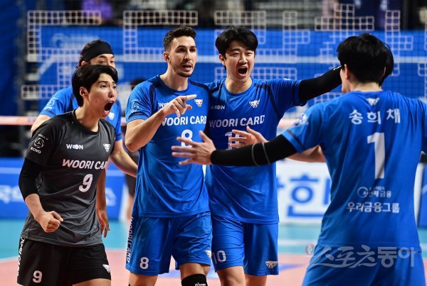 2일 서울 장충체육관에서 열린 ‘2021~2022 도드람 V-리그’ 남자부 서울 우리카드와 인천 대한항공의 경기에서 우리카드 이상욱, 알렉스, 나경복이 득점에 성공한 후 기뻐하고 있다. 장충 | 주현희 기자 teth1147@donga.com
