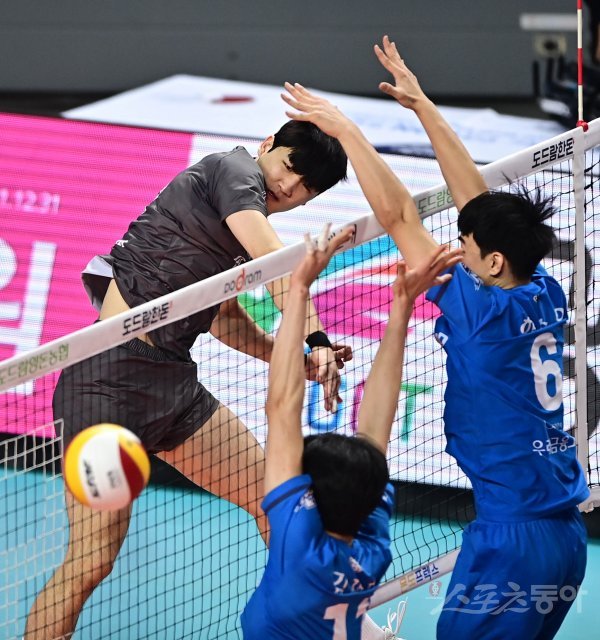 2일 서울 장충체육관에서 열린 ‘2021~2022 도드람 V-리그’ 남자부 서울 우리카드와 인천 대한항공의 경기에서 대한항공 정지석이 스파이크를 때리고 있다. 장충 | 주현희 기자 teth1147@donga.com