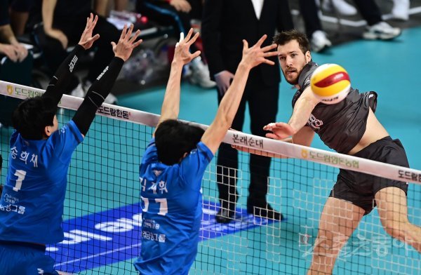 2일 서울 장충체육관에서 열린 ‘2021~2022 도드람 V-리그’ 남자부 서울 우리카드와 인천 대한항공의 경기에서 대한항공 링컨이 우리카드 블로커 앞에서 스파이크를 때리고 있다. 장충 | 주현희 기자 teth1147@donga.com