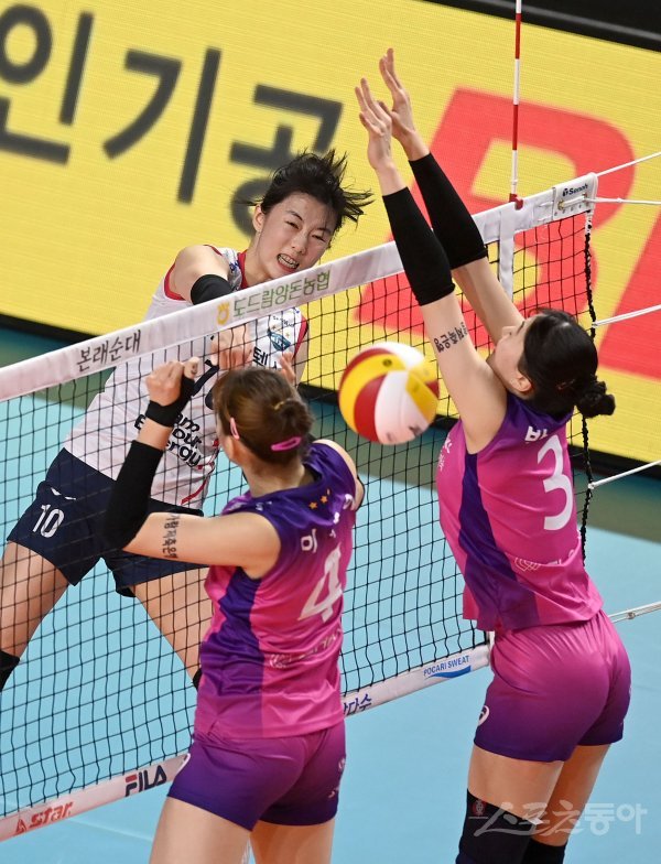 2일 인천 삼산월드체육관에서 열린 ‘2021~2022 도드람 V-리그’ 여자부 흥국생명과 GS칼텍스 경기에서 GS칼텍스 강소휘가 흥국생명의 블로킹 사이로 스파이크를 날리고 있다. 인천 | 김종원 기자 won@donga.com