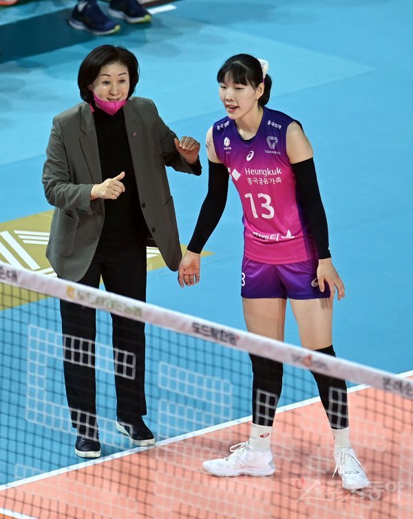 2일 인천 삼산월드체육관에서 열린 ‘2021~2022 도드람 V-리그’ 여자부 흥국생명과 GS칼텍스 경기에서 흥국생명 박미희 감독이 최윤이에게 작전 지시를 하고 있다. 인천 | 김종원 기자 won@donga.com