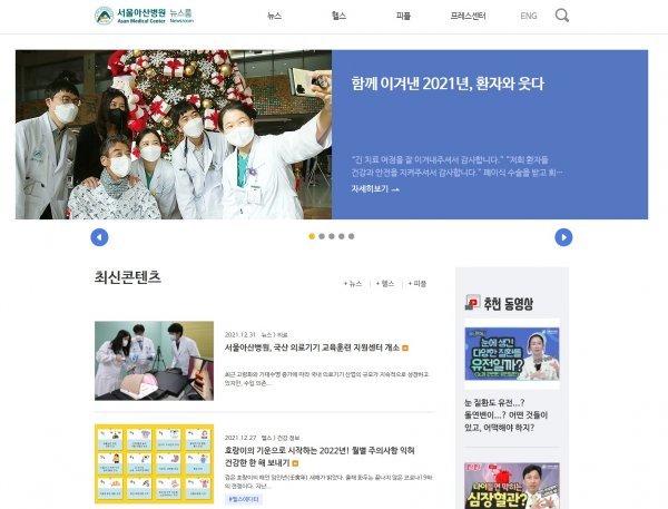 특히 뉴스룸에는 외국인을 위한 영문 사이트도 구축했다. 지난해 서울아산병원에는 코로나19 상황에도 1만2000여 명의 외국인 환자가 찾아와 치료를 받았다. 코로나19 발생 전에는 5000명 가까운 해외 의료진이 서울아산병원을 방문해 의료기술을 배웠다. 이런 성과에 힘입어 서울아산병원은 미국 시사주간지 뉴스위크가 선정한 ‘2021 세계 최고 병원’에서 국내 1위, 세계 34위에 올랐다.