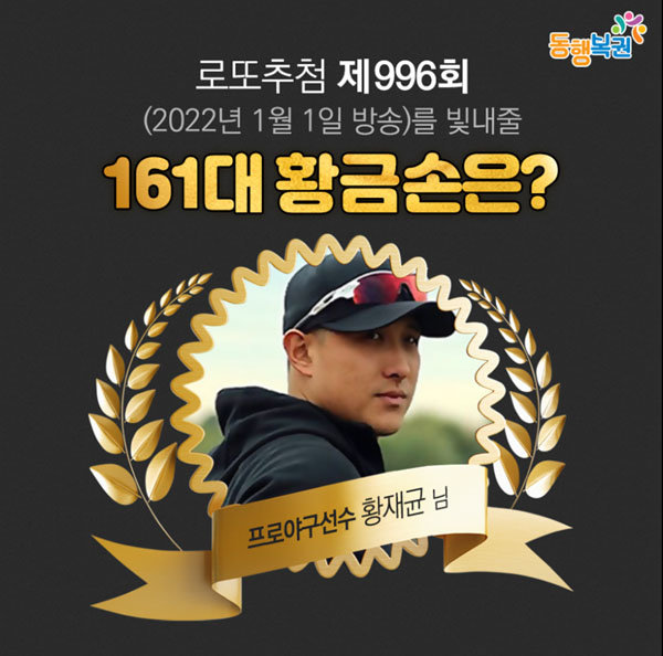 임인년 첫 날, 토요일을 맞아 제996회 로또6/45(로또복권) 추첨이 진행됐다. 이날 추첨 버튼을 누른 ‘황금손’은 황재균(35·KT 위즈)이었다. 지난해 KT의 주장으로 창단 첫 정규시즌-한국시리즈 통합우승을 이끈 기운을 복권 구매자들에게 전달해주길 바라는 의도였다. 여기에는 평소 선행과 봉사에 적극적인 황재균의 성품도 반영된 것으로 알려졌다. 황재균은 올 겨울 각종 TV 예능프로그램에 출연하며 분주한 겨울을 보내고 있다. 연예대상의 시상자로 나서 춤사위까지 펼치며 망가지는 모습도 두려워하지 않았다.