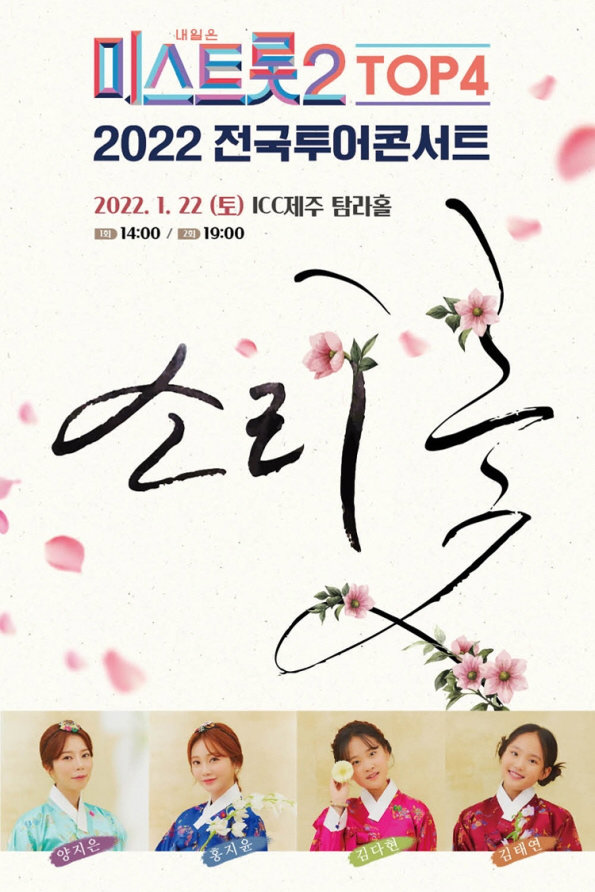 한편, '미스트롯2' TOP4 2022 전국투어 콘서트 '소리 꽃'의 시작을 알릴 제주 공연은 오는 1월 22일 오후 2시와 7시 ICC제주 탐라홀에서 개최된다.