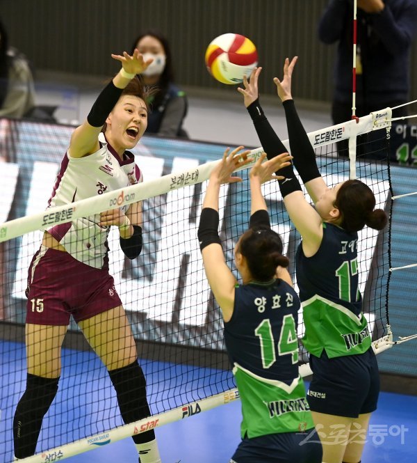 4일 수원체육관에서 열린 ‘2021~2022 도드람 V-리그’ 여자부 현대건설과 KGC인삼공사 경기에서 KGC인삼공사 이선우가 현대건설의 블로킹 사이로 스파이크를 날리고 있다. 수원 | 김종원 기자 won@donga.com