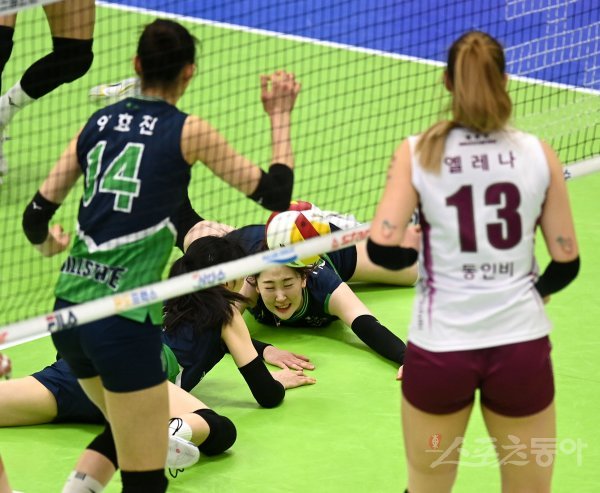 4일 수원체육관에서 열린 ‘2021~2022 도드람 V-리그’ 여자부 현대건설과 KGC인삼공사 경기에서 현대건설 고예림이 디그에 실패하고 있다. 수원 | 김종원 기자 won@donga.com