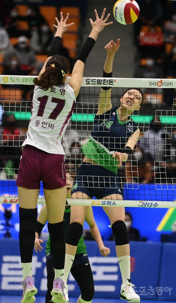 4일 수원체육관에서 열린 ‘2021~2022 도드람 V-리그’ 여자부 현대건설과 KGC인삼공사 경기에서 현대건설 양효진이 KGC인삼공사의 블로킹 사이로 스파이크 공격을 하고 있다. 수원 | 김종원 기자 won@donga.com