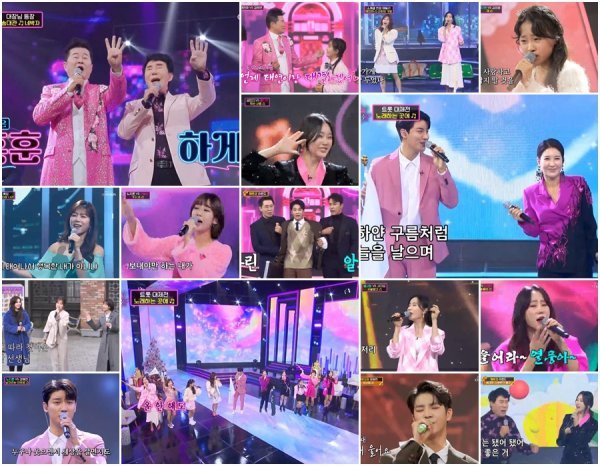 그리고 ‘미스트롯2’ 멤버들과 서지오, 노지훈이 함께 ‘노래하는 곳에’를 부르며 신년특집 ‘트롯대제전’을 개최했다. 더불어 트롯 거장이자 세기의 라이벌 송대관, 태진아가 등장했고, 태진아는 ‘옥경이’를, 송대관은 ‘네박자’를 택해 가히 트롯 가왕다운 레전드 열창을 전했다. 그러던 중 태진아가 송대관을 향해 “제가 업어 키운 가수 송대관입니다!”라는 도발적인 소개 멘트를 내뱉었고, 송대관이 태진아를 가리키며 “여기 나오면서 이걸 데리고 나왔다”고 강력하게 응수해 한바탕 폭소를 자아냈다.