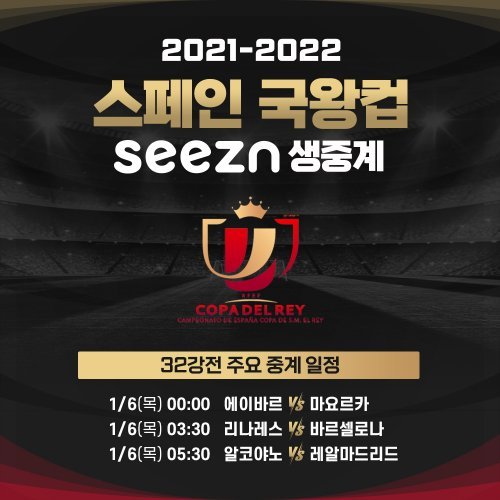 시즌은 6일 0시 이강인의 소속팀인 레알 마요르카와 에이바르의 경기를 시작으로 스페인 국왕컵 경기 32강전부터 결승전까지 주요 경기를 생중계한다.