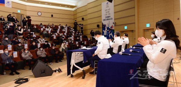 5일 충북 진천국가대표선수촌에서 열린 ‘2022 베이징 동계올림픽 G-30 미디어데이’ 대한민국선수단 합동 기자회견에 앞서 대한체육회 이기흥 회장, 윤홍근 선수단장, 유인탁 선수촌장을 비롯한 선수와 감독이 손뼉을 치고 있다.