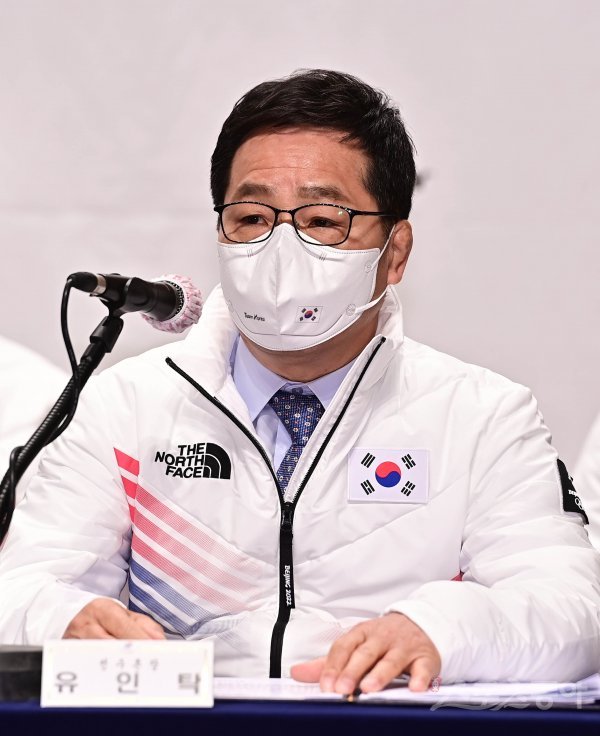 5일 충북 진천국가대표선수촌에서 열린 ‘2022 베이징 동계올림픽 G-30 미디어데이’ 대한민국선수단 합동 기자회견에서 대한체육회 유인탁 선수촌장이 인사말을 하고 있다.