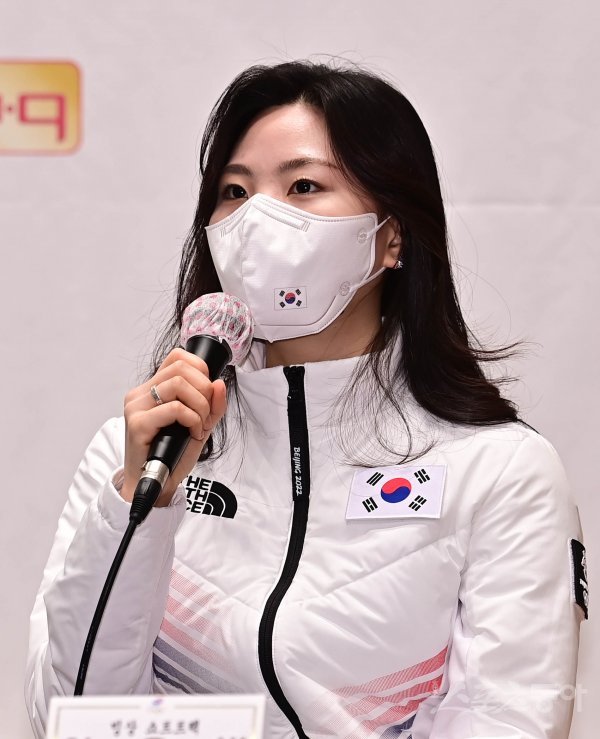 5일 충북 진천국가대표선수촌에서 열린 ‘2022 베이징 동계올림픽 G-30 미디어데이’ 대한민국선수단 합동 기자회견에서 쇼트트랙 이유빈이 취재진의 질문에 답하고 있다.