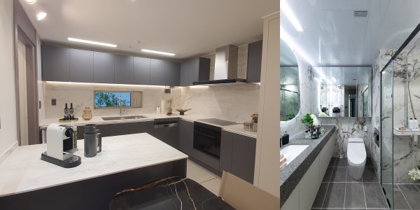 드레스룸은 기존보다 더욱 확장돼 하프미러 형태의 유리로 거울이 없어도 도어를 보며 옷을 입을 수 있도록 했다. 주방은 단색으로 이루어진 상·하부장에서 주방 상판 및 벽체가 입체감있게 표현되는 깊이감 있는 자재로 변경되며, 입체감을 표현하기 위해 상·하부장과 상판의 색감을 대비해 표현했다.