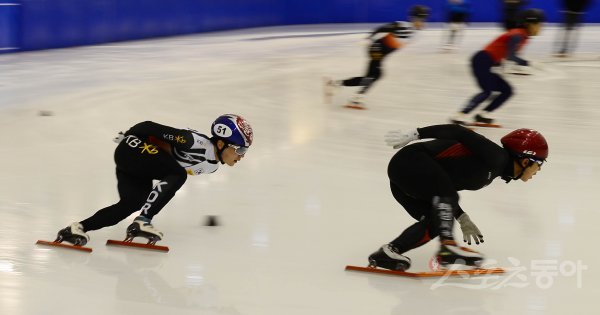 5일 충북 진천국가대표선수촌에서 열린 ‘2022 베이징 동계올림픽 G-30 미디어데이’ 종목별 공개 훈련에서 쇼트트랙 김동욱(왼쪽)이 혼성 계주 연습을 하고 있다.