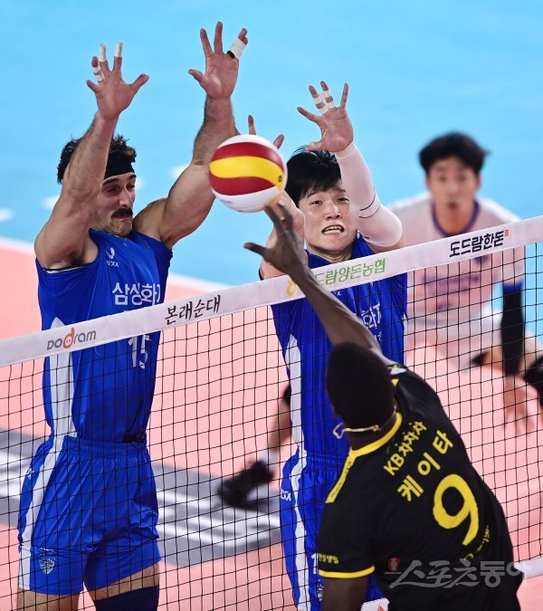 5일 대전충무체육관에서 열린 ‘2021~2022 도드람 V-리그’ 남자부 대전 삼성화재와 의정부 KB손해보험 경기에서 삼성화재 러셀과 안우재가 블로킹을 하고 있다.