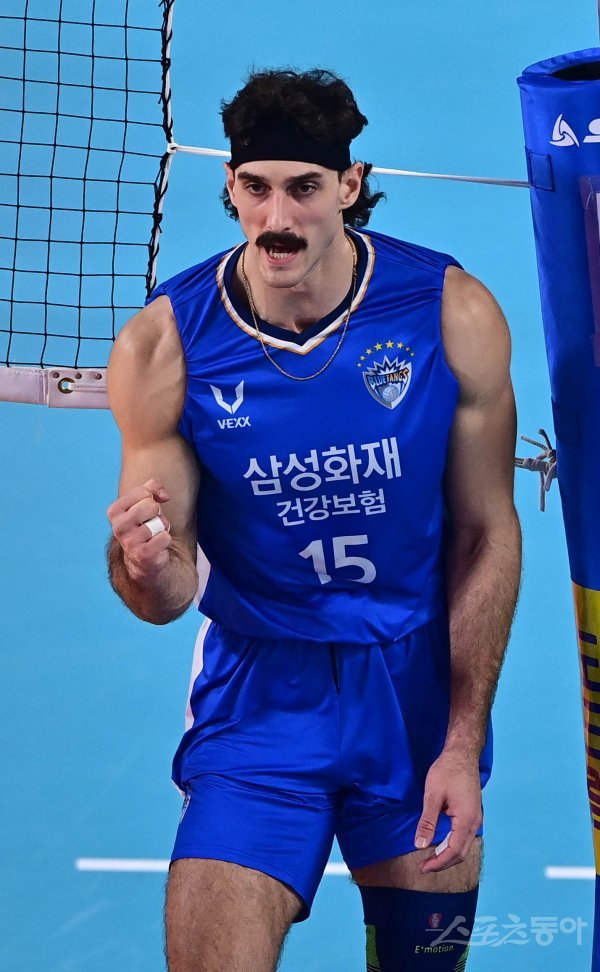 5일 대전충무체육관에서 열린 ‘2021~2022 도드람 V-리그’ 남자부 대전 삼성화재와 의정부 KB손해보험 경기에서 삼성화재 러셀이 블로킹 득점에 성공한 후 세리머니를 하고 있다.