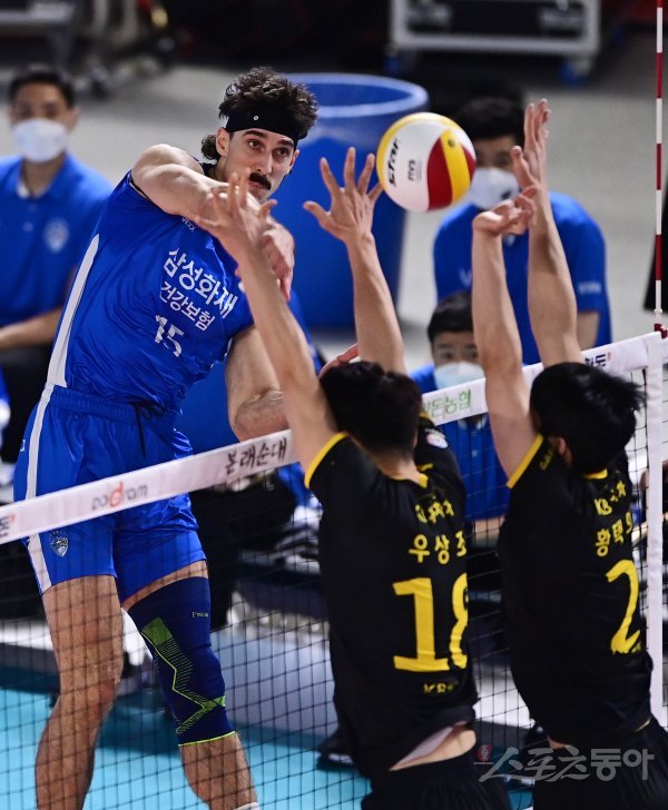 5일 대전충무체육관에서 열린 ‘2021~2022 도드람 V-리그’ 남자부 대전 삼성화재와 의정부 KB손해보험 경기에서 삼성화재 러셀이 KB손해보험 블로커 사이로 스파이크를 때리고 있다.