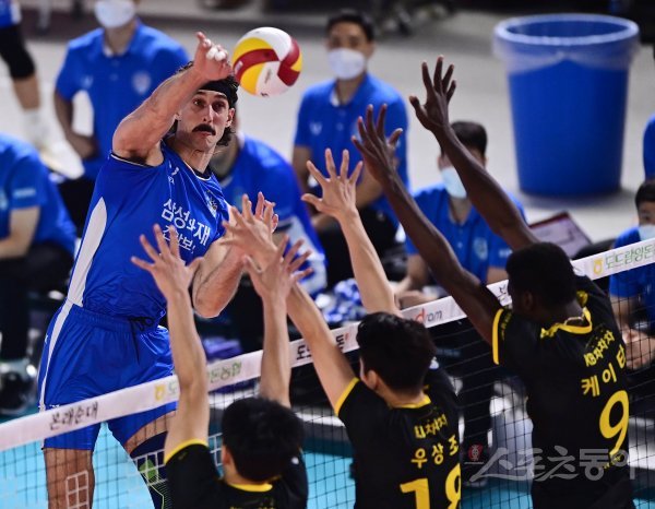 5일 대전충무체육관에서 열린 ‘2021~2022 도드람 V-리그’ 남자부 대전 삼성화재와 의정부 KB손해보험 경기에서 삼성화재 러셀이 KB손해보험 블로커 위로 스파이크를 때리고 있다.