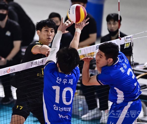 5일 대전충무체육관에서 열린 ‘2021~2022 도드람 V-리그’ 남자부 대전 삼성화재와 의정부 KB손해보험 경기에서 KB손해보험 한성정이 스파이크를 때리고 있다.