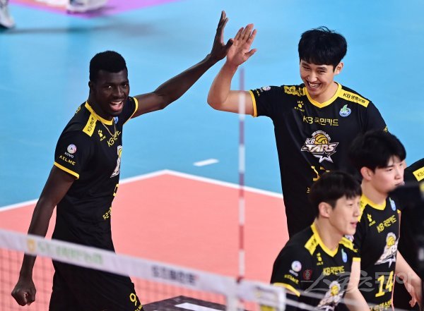 5일 대전충무체육관에서 열린 ‘2021~2022 도드람 V-리그’ 남자부 대전 삼성화재와 의정부 KB손해보험 경기에서 KB손해보험 케이타와 한성정이 득점에 성공한 후 하이파이브를 하고 있다.