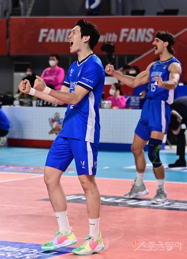 5일 대전충무체육관에서 열린 ‘2021~2022 도드람 V-리그’ 남자부 대전 삼성화재와 의정부 KB손해보험 경기에서 KB손해보험에 세트스코어 3-2로 승리를 거둔 삼성화재 황경민이 환호하고 있다.