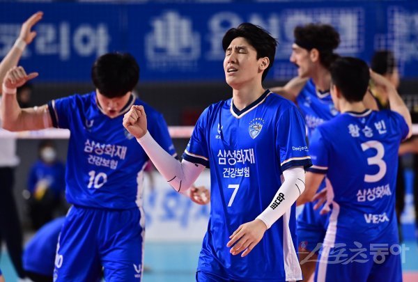 5일 대전충무체육관에서 열린 ‘2021~2022 도드람 V-리그’ 남자부 대전 삼성화재와 의정부 KB손해보험 경기에서 삼성화재 신장호가 득점에 성공한 후 기뻐하고 있다.