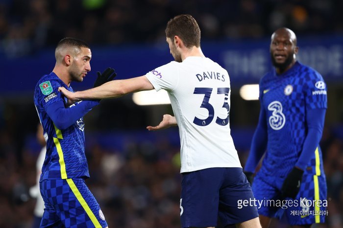 토트넘 홋스퍼의 벤 데이비스가 2022년 1월 5일 영국 런던의 스탬퍼드 브리지에서 열린 첼시-토트넘 홋스퍼의 카라바오컵 준결승 1차전 경기에서 하킴 지예흐(첼시)와 격돌하고 있다.