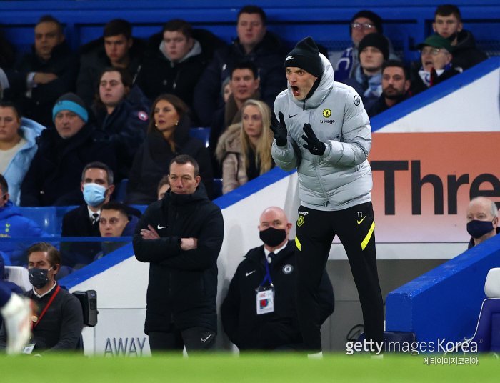 토마스 투켈 첼시 감독이 2022년 1월 5일 영국 런던의 스탬퍼드 브리지에서 열린 첼시-토트넘 홋스퍼의 카라바오컵 준결승 1차전 경기에서 선수들을 독려하고 있다.