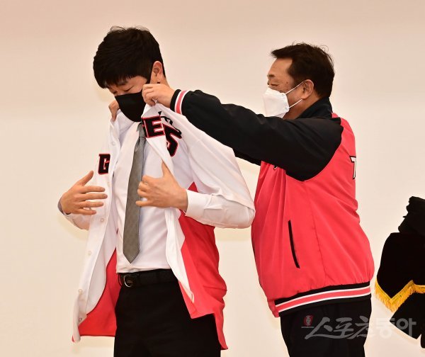 6일 광주 기아 오토랜드 광주 대강당에서 열린 ‘KIA 타이거즈 김종국 감독 취임식’에서 김종국 신임 감독이 유니폼을 입고 있다.