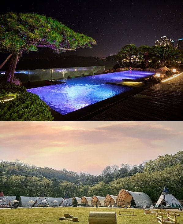 해운대 파라다이스호텔 부산의 씨메르 ‘갤럭시 스파’(위 사진). 개관 40주년을 맞아 스파 시설을 리모델링 하고 밤에만 운영하면서 ‘별멍’에 특화됐다. 아이들의 캠핑체험과 친환경 숲에서의 다양한 글램핑을 즐길 수 있는 그랜드 워커힐 서울의 ’포레스트 파크’(아래 사진). 숲과 환경에 대한 가치소비를 활용한 키 테넌트 시설이다.