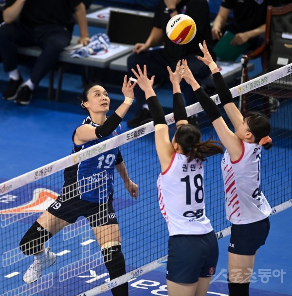 6일 화성종합경기타운 실내체육관에서 열린 ‘2021~2022 도드람 V-리그’ 여자부 IBK기업은행과 GS칼텍스 경기에서 IBK기업은행 표승주가 GS칼텍스의 블로킹 사이로 밀어넣기 공격을 하고 있다.
