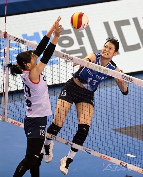 6일 화성종합경기타운 실내체육관에서 열린 ‘2021~2022 도드람 V-리그’ 여자부 IBK기업은행과 GS칼텍스 경기에서 IBK기업은행 최정민이 GS칼텍스의 블로킹 사이로 스파이크 공격을 하고 있다.