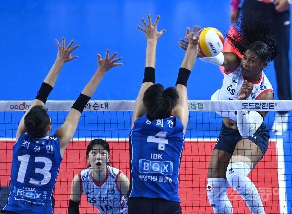 6일 화성종합경기타운 실내체육관에서 열린 ‘2021~2022 도드람 V-리그’ 여자부 IBK기업은행과 GS칼텍스 경기에서 GS칼텍스 모마가 IBK기업은행의 블로킹 사이로 스파이크 공격을 하고 있다.