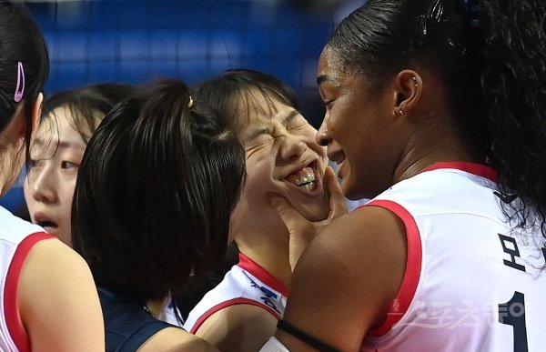 6일 화성종합경기타운 실내체육관에서 열린 ‘2021~2022 도드람 V-리그’ 여자부 IBK기업은행과 GS칼텍스 경기에서 GS칼텍스 유서연이 득점에 성공한 후 동료들의 축하를 받고 있다.